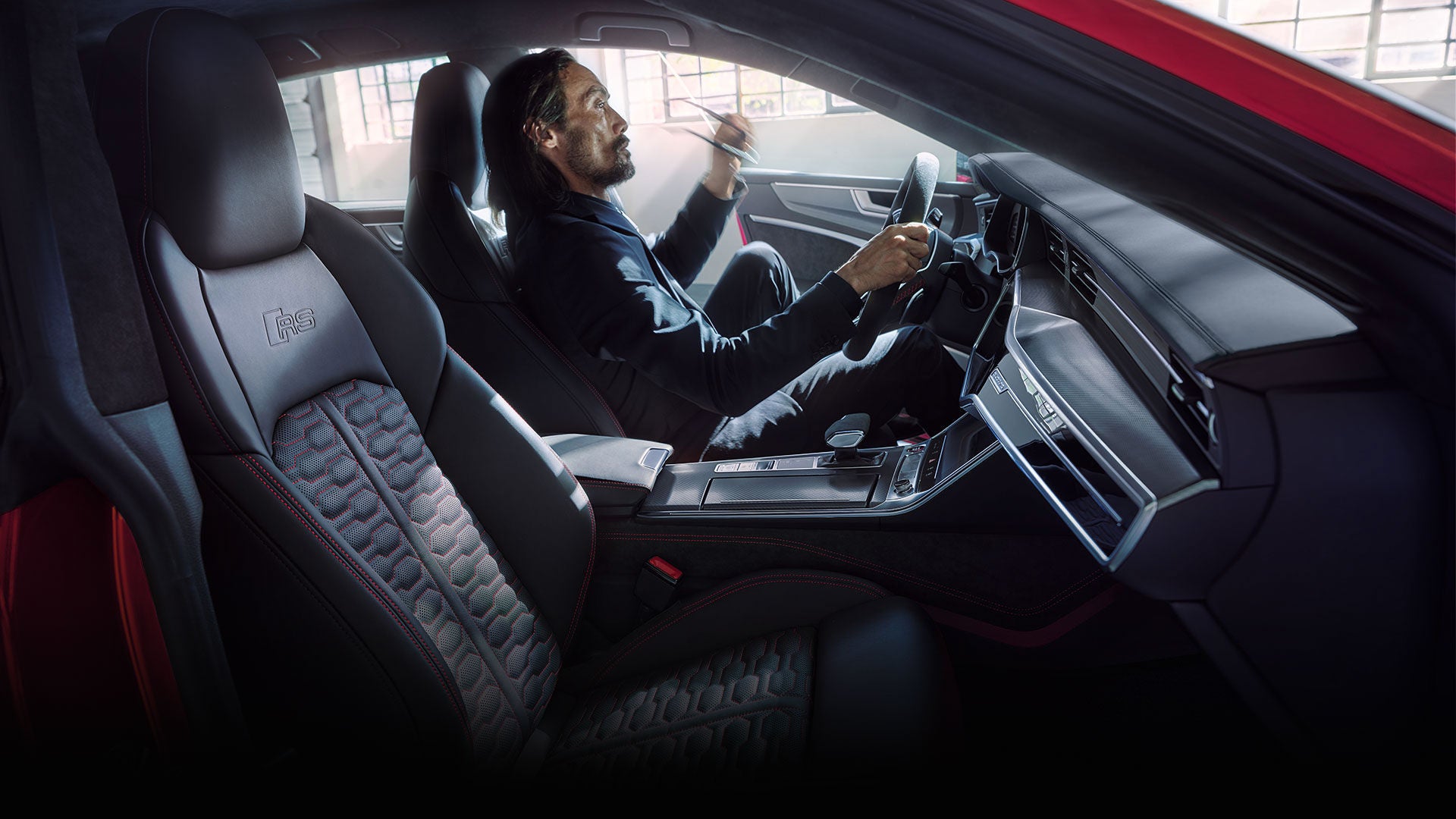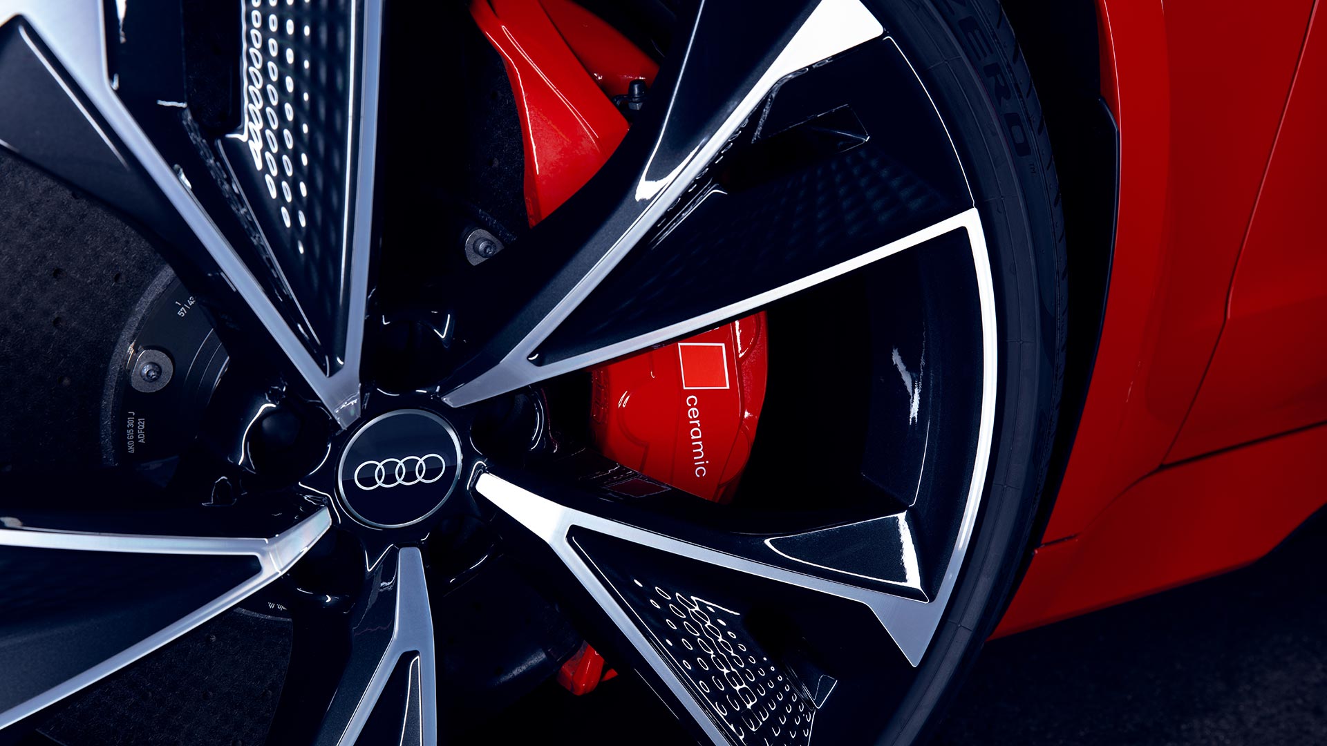 Very few sights genuinely take your breath away. One that does is the optional 22-inch wheel in an exclusive 5-V-spoke structure design in anthracite black with gloss turned finish. Another is the optional RS ceramic brake system with brake callipers in red and “Audi ceramic” logo.